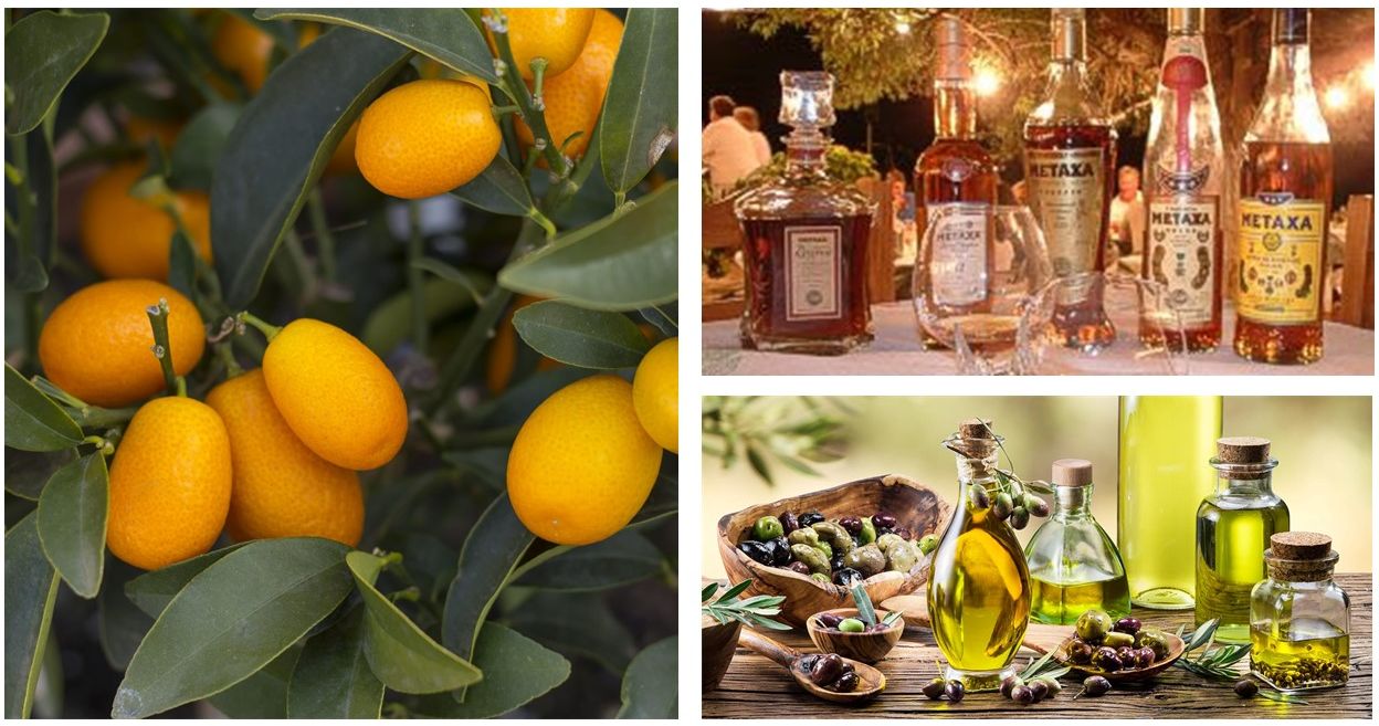 Na początku należy wymienić oliwki i wszystko, co z nich powstaje: oliwę, którą mieszkańcy Korfu nazywają „złotym płynem”, pasty oliwne i różne marynaty. Drugim towarem eksportowym wyspy jest kumkwat, owoc cytrusowy, który sprowadzono na wyspę z Chin w latach 60. XIX wieku. Robi się z niego wyśmienite dżemy, marmolady, likiery czy cukierki. Do barku i na prezenty proponujemy także zakup znanej Metaxy oraz Tsipouro – mocnej wódki z winogron. Godne polecenia jest też powszechnie pite na Korfu piwo imbirowe (tzitzinbirra), relikt z czasów, gdy wyspą rządzili Brytyjczycy.