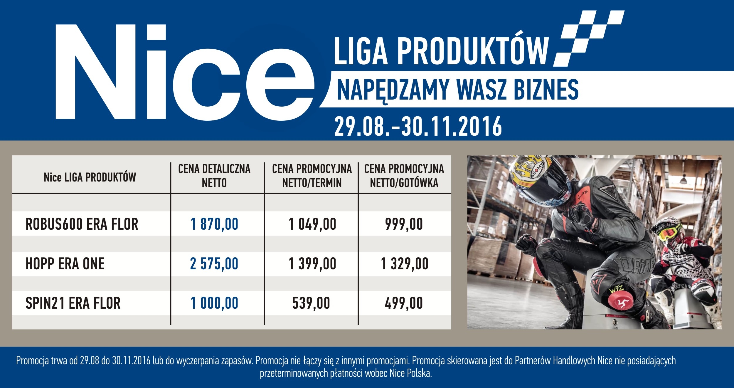 Zapraszamy do tradycyjnej jesiennej promocji. Tym razem w Nice Lidze Produktów dostępne są trzy zaawansowane technologicznie zestawy automatyki: Robus600, Hopp oraz Spin21. Promocyjne ceny obowiązują do końca listopada 2016 r., bez względu na liczbę zakupionych sztuk.