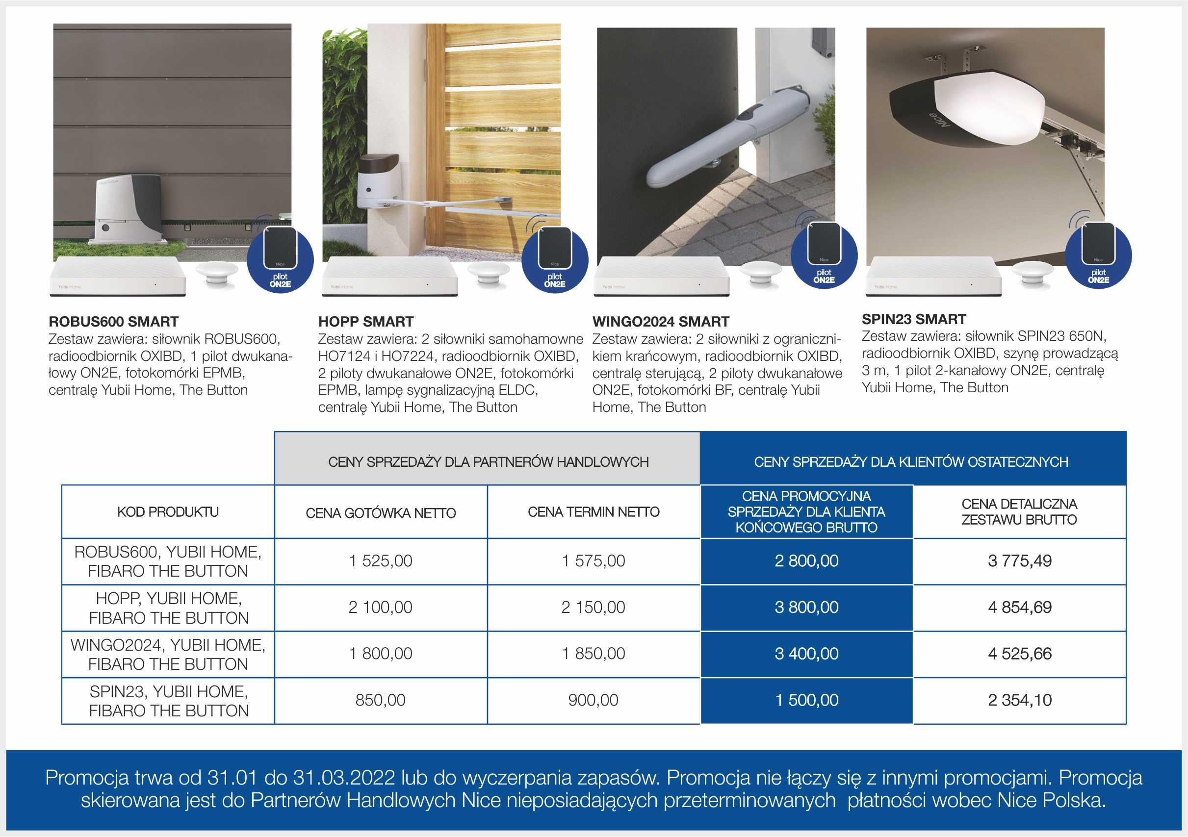 Zapraszamy do skorzystania z wyjątkowej promocji na SMART ZESTAWY oferowane przez Nice i FIBARO. Zestawy te pomogą użytkownikom wykonać pierwszy krok w kierunku budowy własnego systemu Smart Home. Poniżej znajdziecie Państwo ceny sprzedaży dla Partnerów Nice oraz promocyjne ceny dla klientów ostatecznych. Promocja obowiązuje od 31.01 do 31.03.2022.