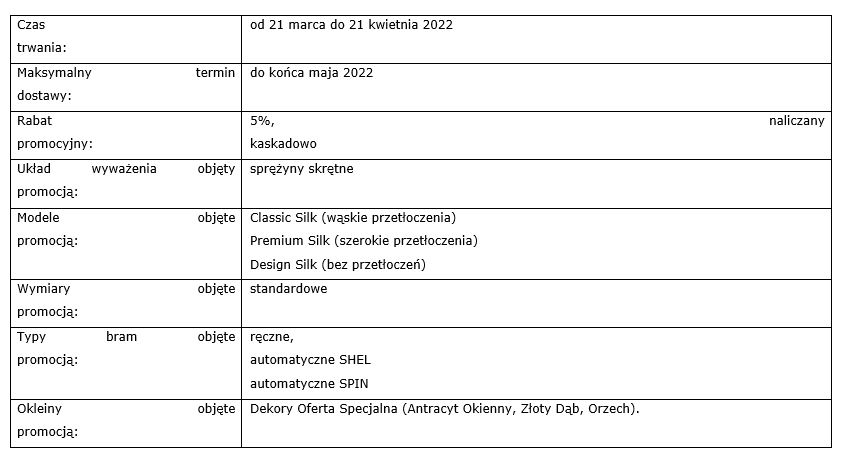 Prezentowana promocja dotyczy wymiarów standardowych trzech modeli bram garażowych 40 mm – Classic, Premium oraz Design, ze sprężynami skrętnymi i wszystkich konfiguracji obsługi - ręczna, automatyczna SHEL oraz automatyczna SPIN.
