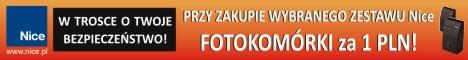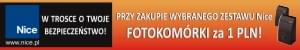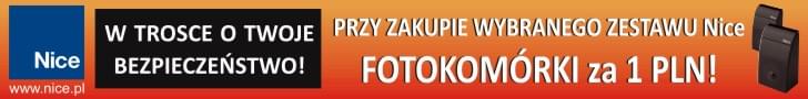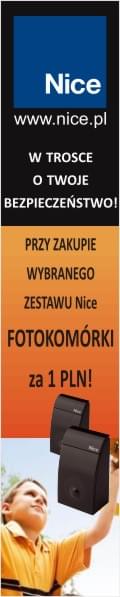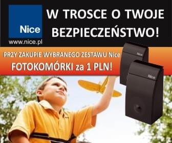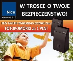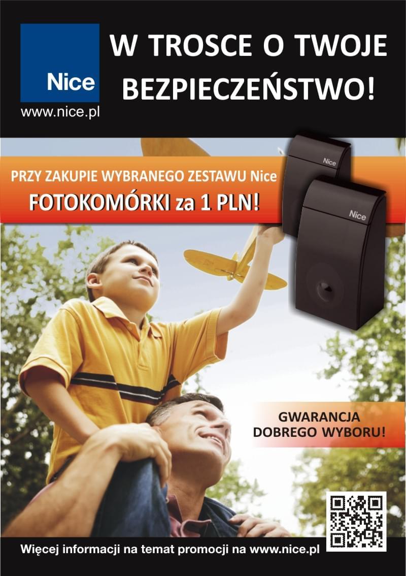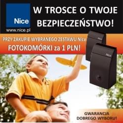 „Fotokomórki za 1 PLN” to akcja promocyjna, która ma na celu wzrost Państwa sprzedaży dzięki uatrakcyjnieniu trzech zestawów z oferty specjalnej Nice. Do każdego zakupionego zestawu Robo500, Wingo2024 oraz Wingo3524 otrzymają Państwo komplet fotokomórek Nice FK w cenie 1 PLN netto. W ten sposób sugerowana cena detaliczna dla klienta końcowego wymienionych zestawów zmniejszy się nawet o 8%! Akcja potrwa do końca kwietnia 2013 r.